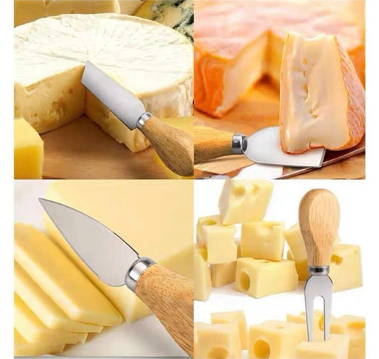 Mini Conjunto Kit 4 Peças em aço e Madeira - Garfo, Faca, Corta, Espátula, Frios...